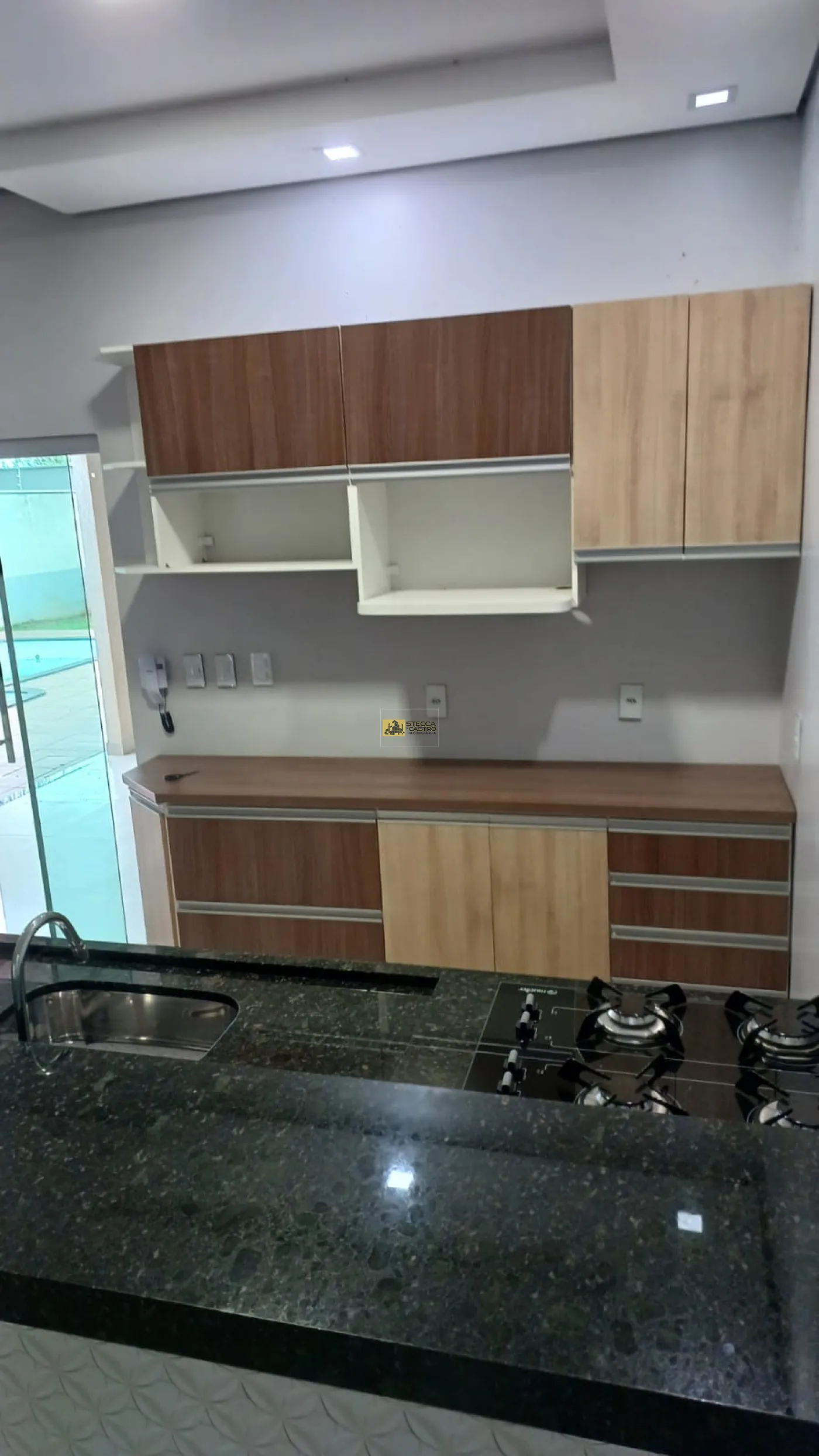 SALA DE JANTAR CONJUGADA COM A COZINHA PLANEJADA, EQUIPADA COM ARMÁRIOS, PIA E COOKTOP;
