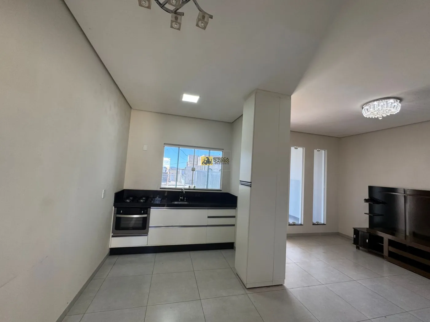 Sala integrada à cozinha, com ambiente prático e funcional